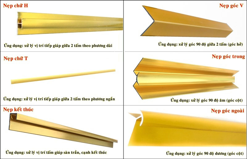 Nẹp kim loại màu vàng, trắng (màu nhôm), tím là các màu nẹp kim loại phụ kiện thi công tấm vân đá được sử dụng nhiều nhất hiện nay trong trang trí mảng tường, vách ngăn. Được sản xuất chuyên để lắp đặt với tấm nhựa PVC vân đá, không bị xuống màu, không rỉ sét, độ bền cao.
