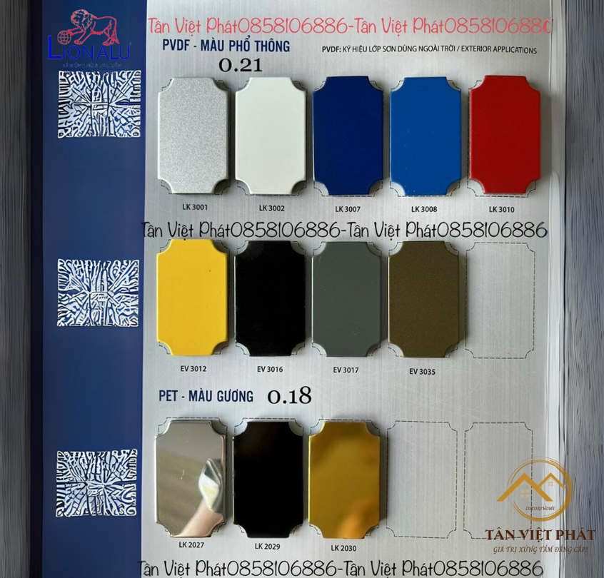 Độ dày của lớp nhôm: độ dày đa dạng từ 0.06, 0.08, 0.11 cho đến 0.21cm, trong đó thông dụng nhất là 0.06 và 0.21cm. Màu sắc của lớp nhôm này rất đa dạng cho bạn lựa chọn.