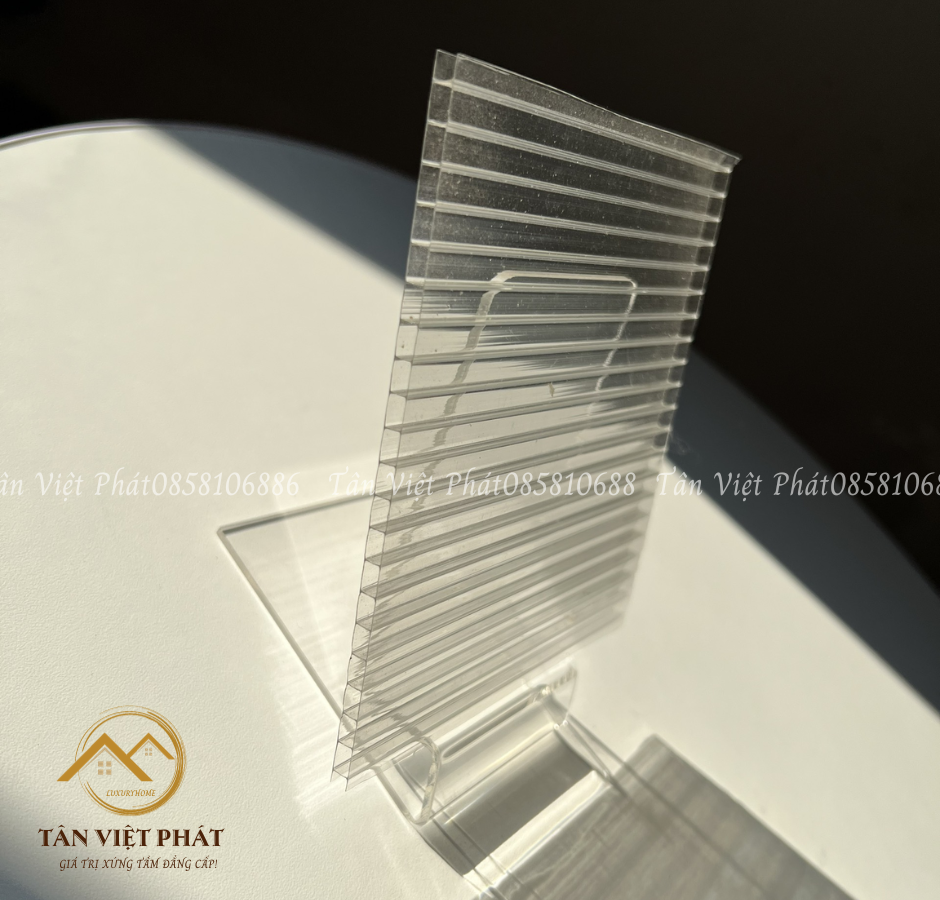 Tâm poly rỗng ruột được thiết kế dạng ruột rỗng tổ ong, có kích thước nhỏ, chịu lực tốt, độ dày tấm lớn. Tấm poly rỗng ruột có thể sử dụng lợp mái che cho các công trình có kích thước nhỏ, có độ dốc nhỏ như mái hiên, mái sân thượng, mái poly giếng trời..